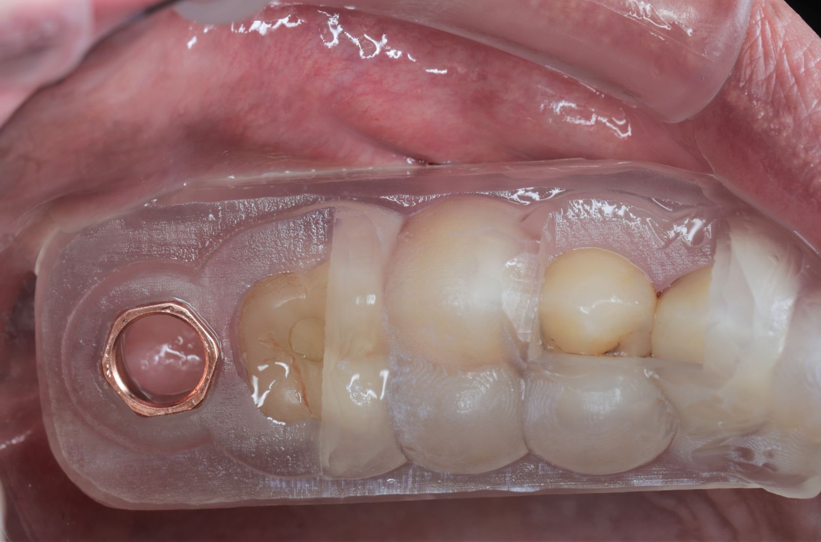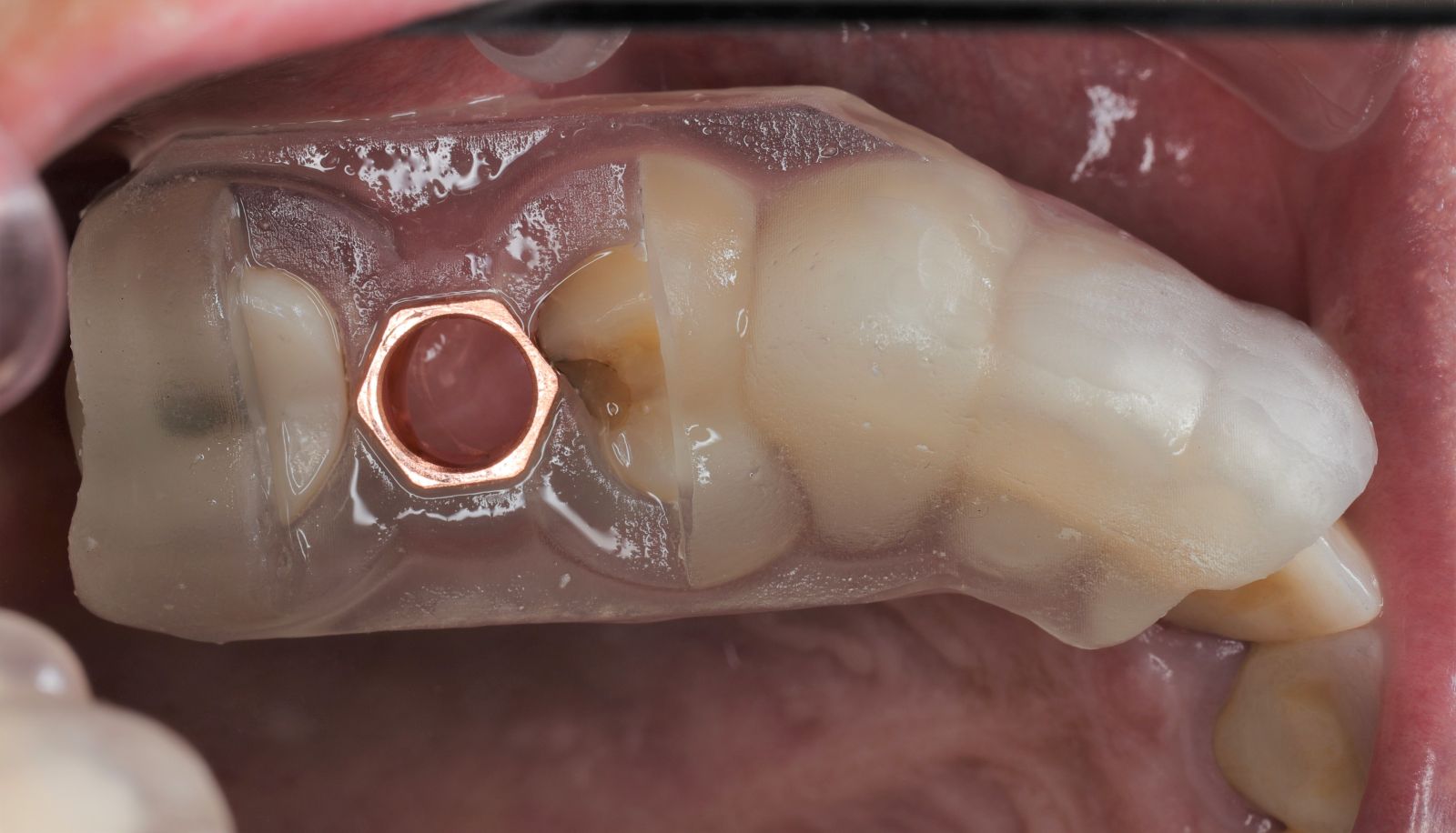- 藉由導板的定位,無須劃開傷口,精準的植入植體。