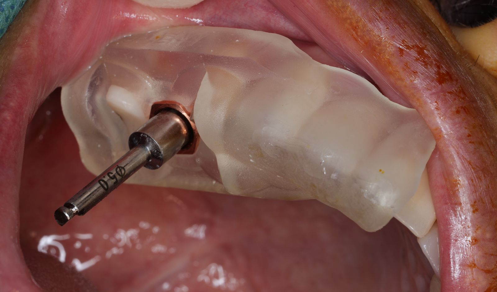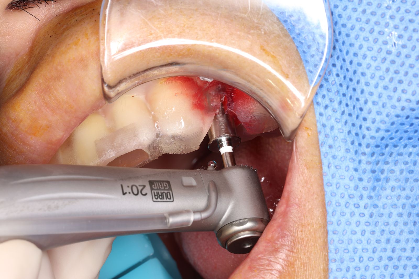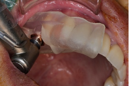 - 手術過程,在植入植體前先用導板定位,確認植牙位置及角度。使用導板讓傷口範圍縮小。