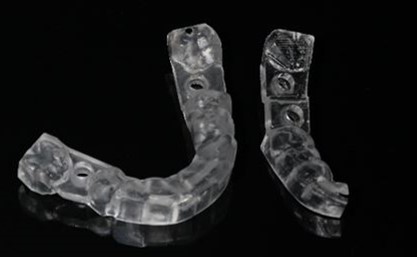 - 手術過程,在植入植體前先用導板定位,確認植牙位置及角度。