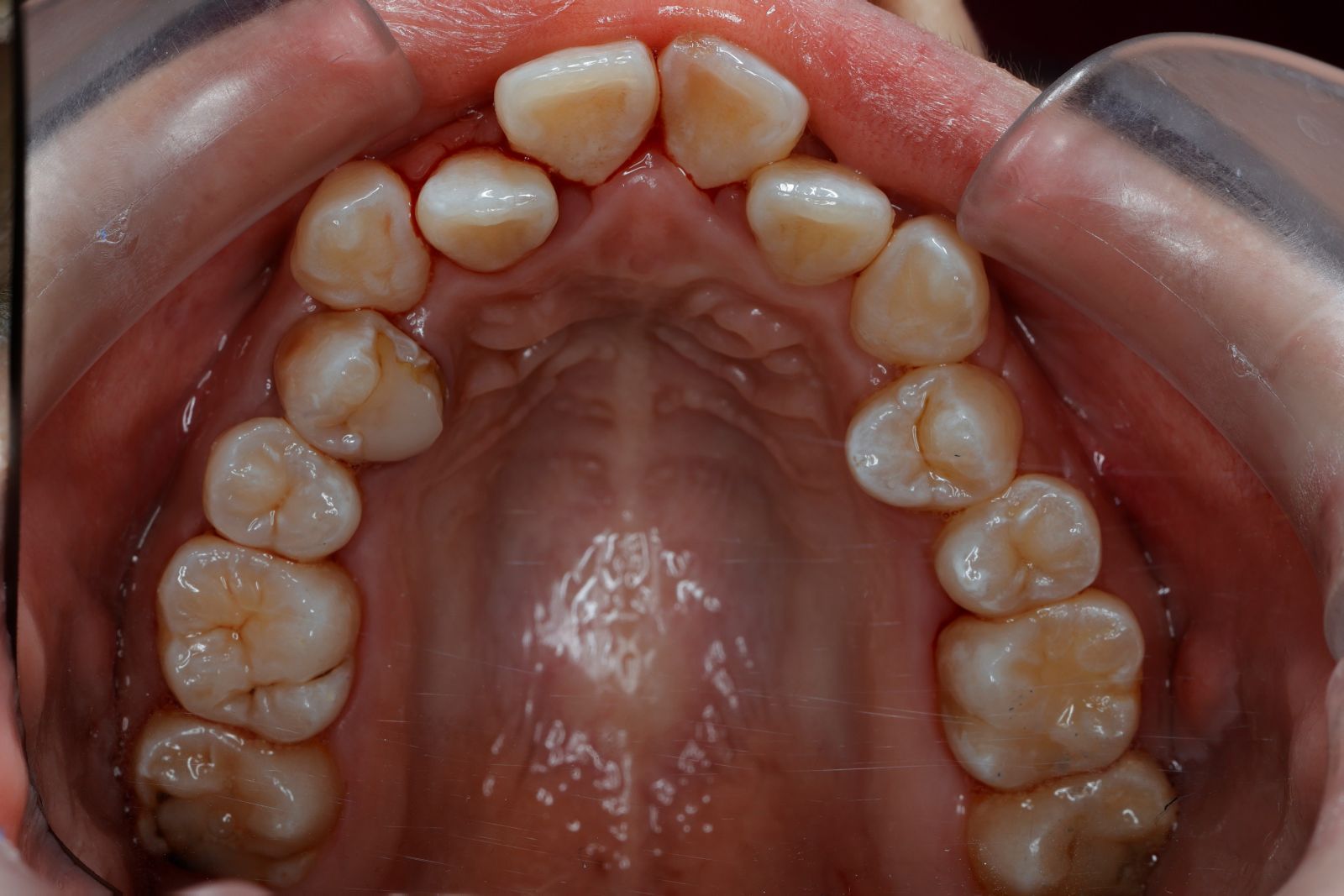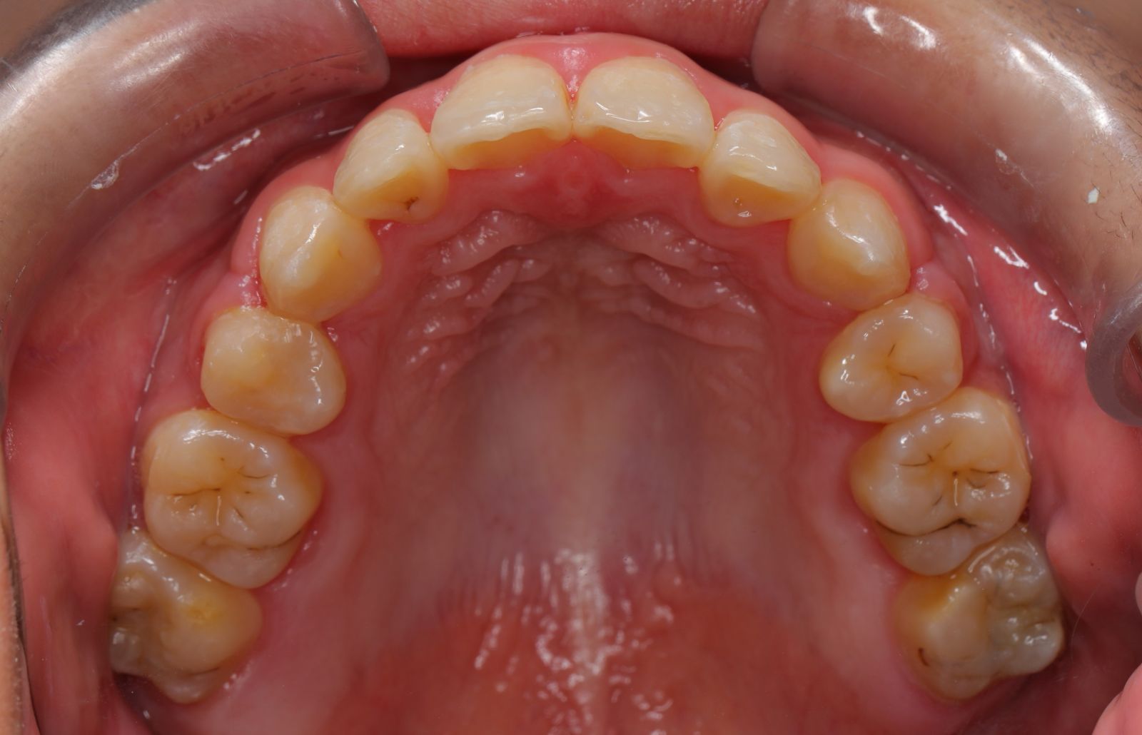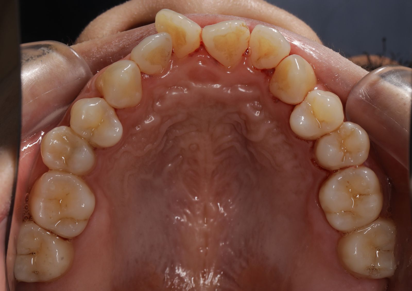 牙弓狹窄,呈現”v”型,導致牙齒凌亂,間接造成咬合不正