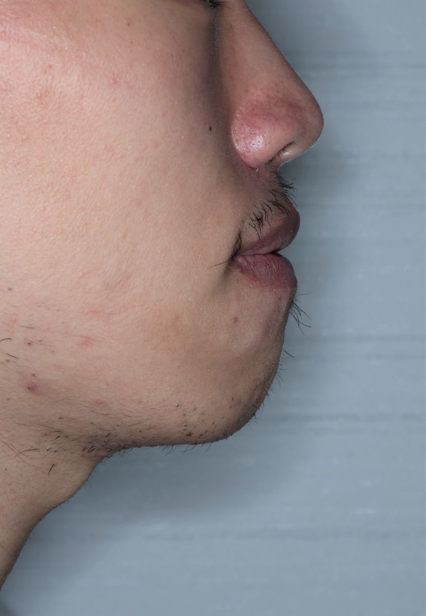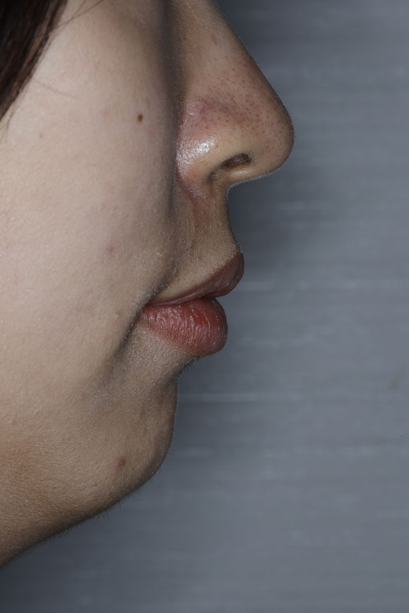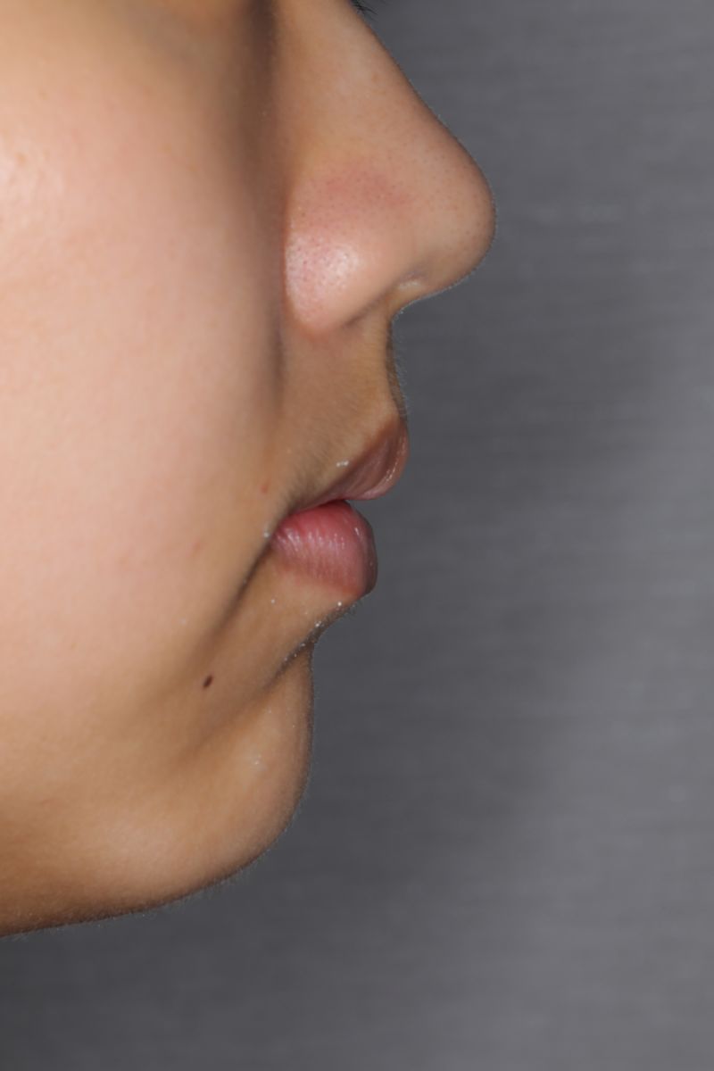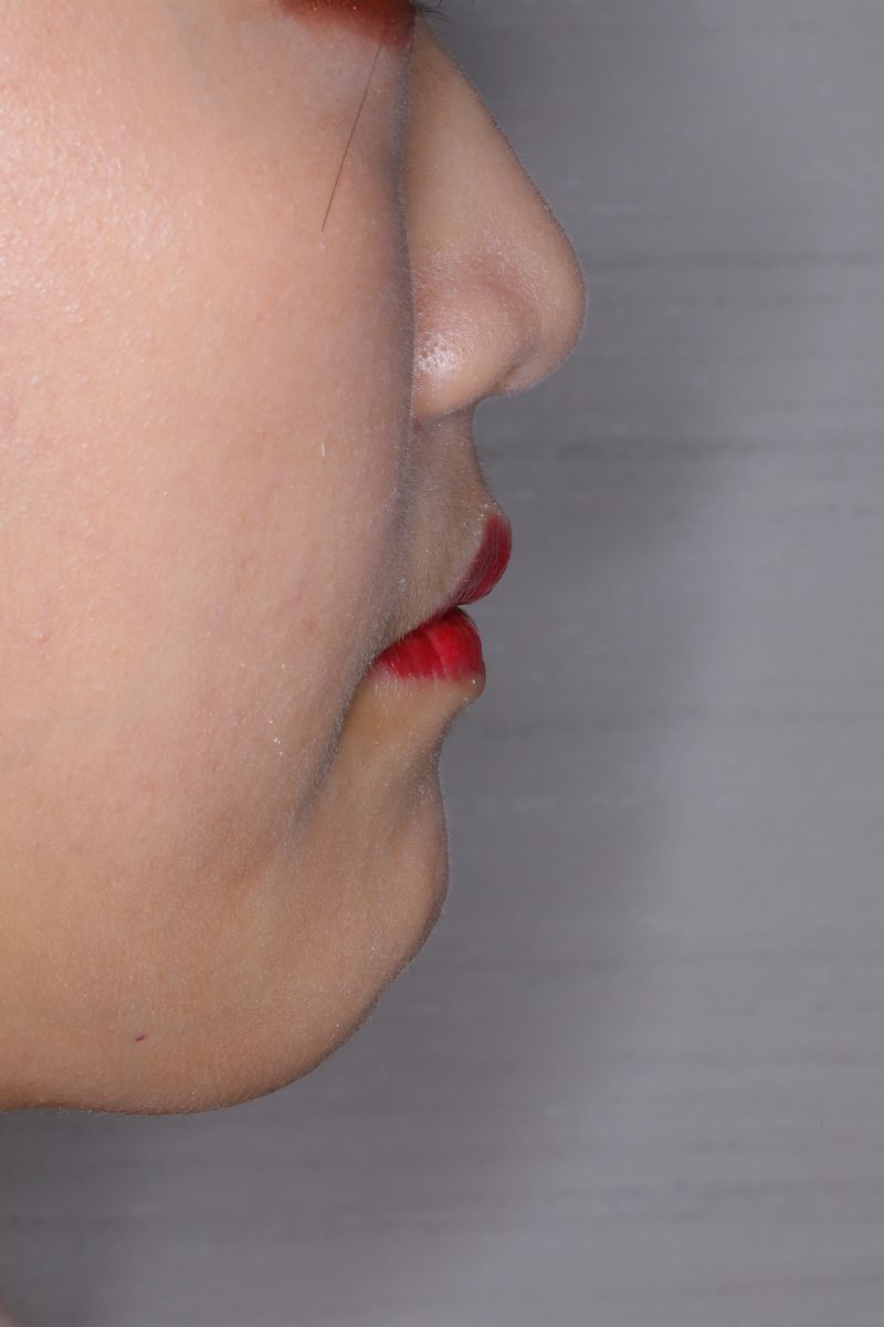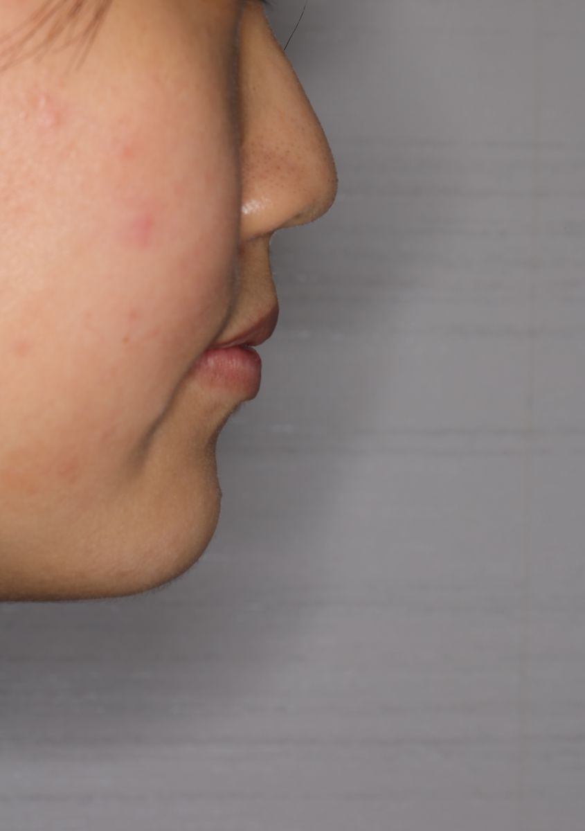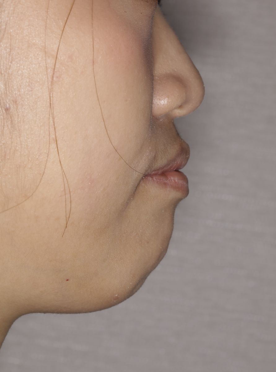 側面線條下唇明顯往後縮,下巴的不對稱歪斜因為中線對好後改善。