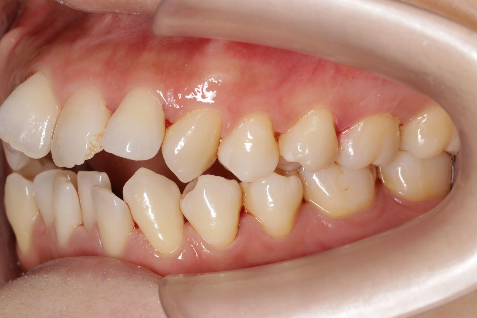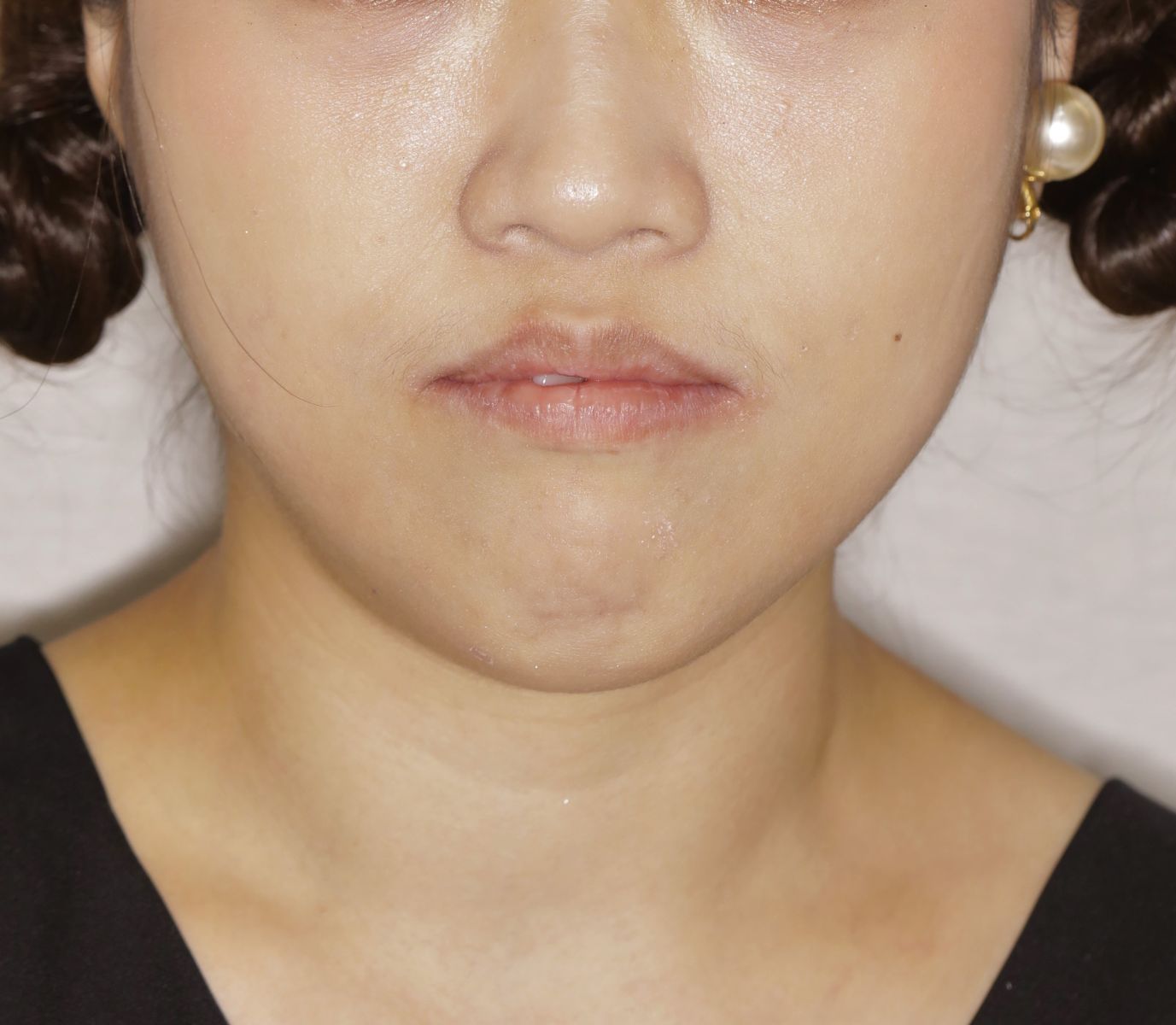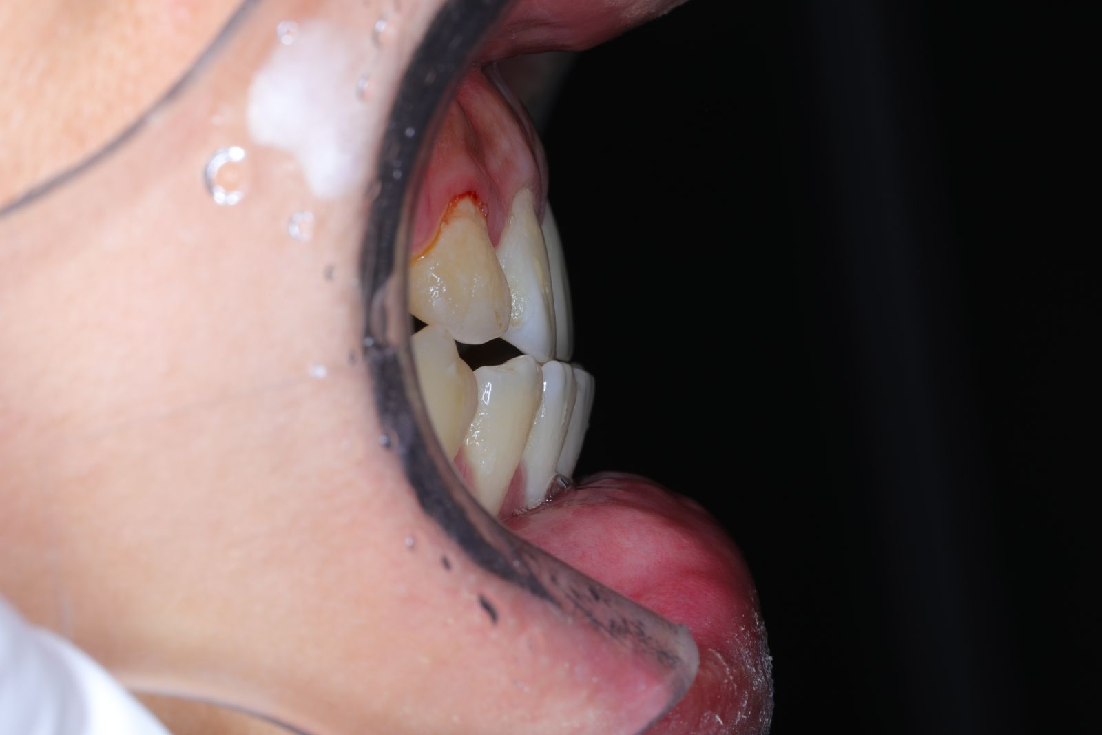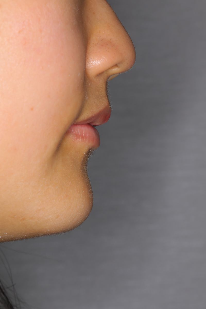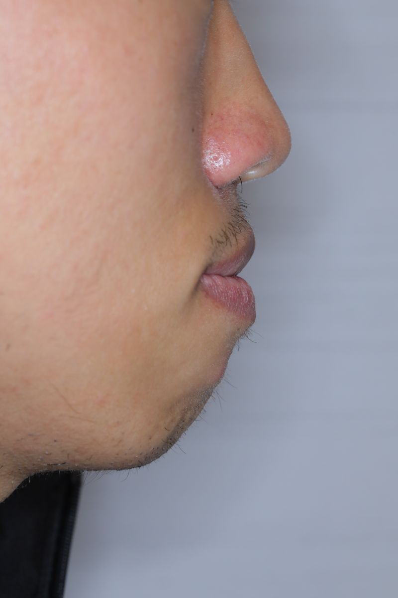 側面線條下唇明顯往後縮,下巴的不對稱歪斜因為中線對好後改善。