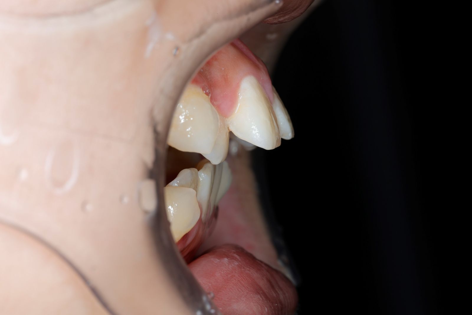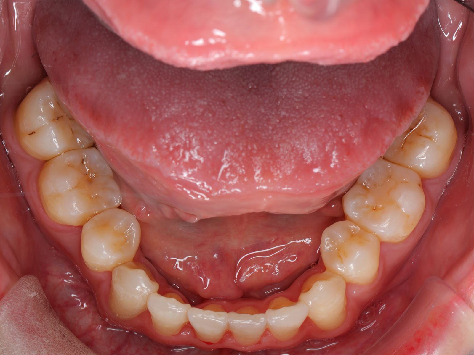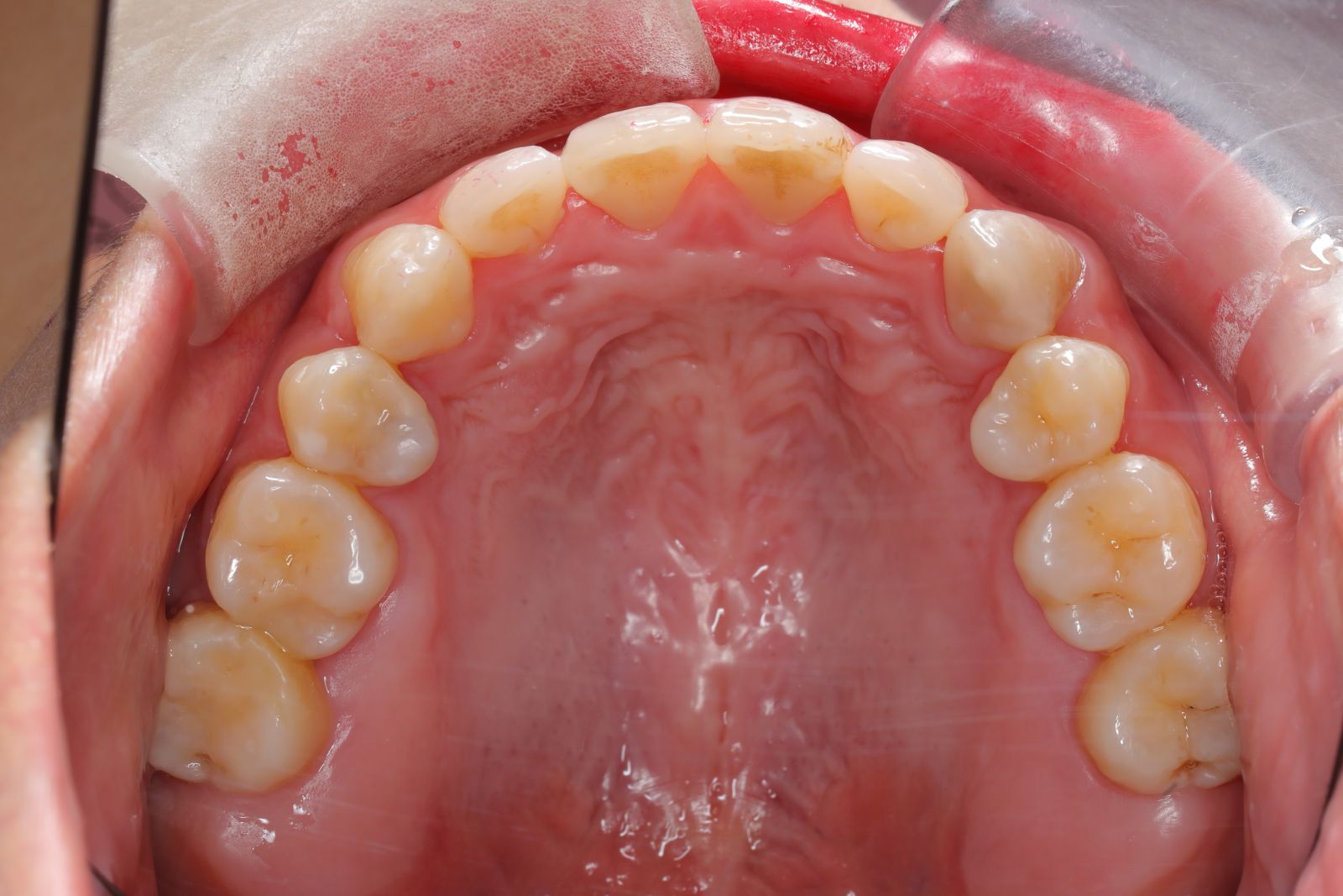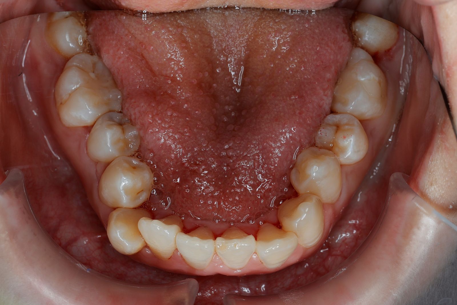 前牙關縫後把牙齒拉到正確咬合關係,中線對好後讓左右咬合對稱