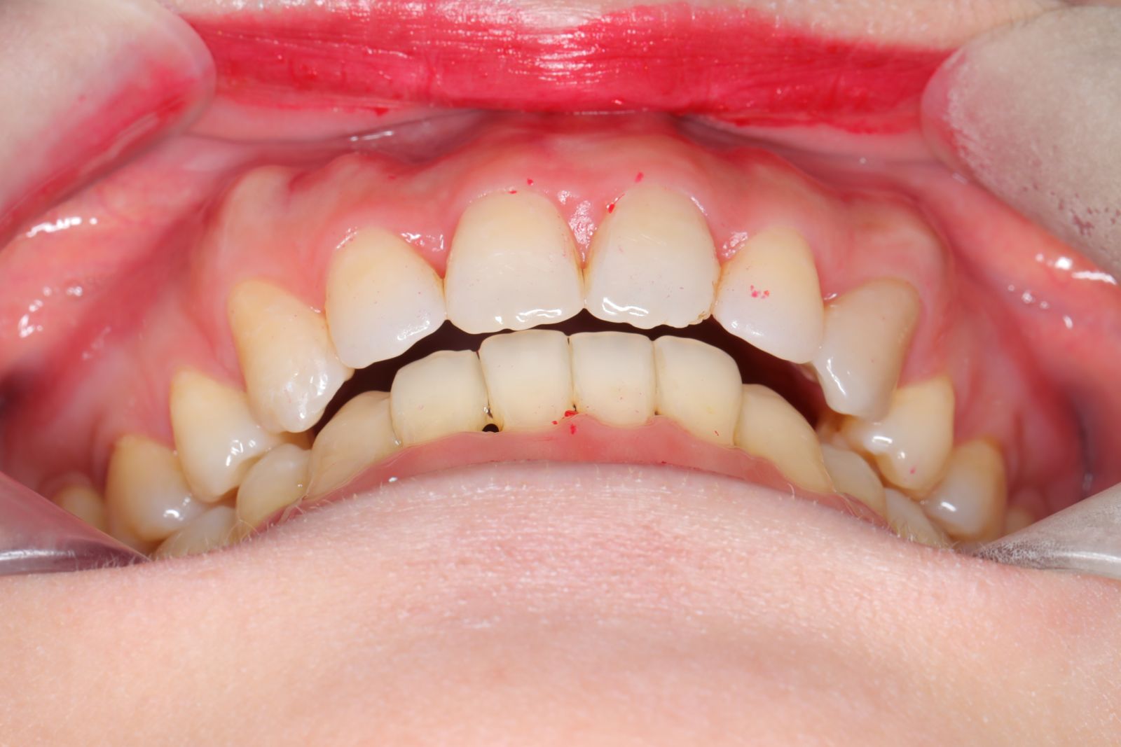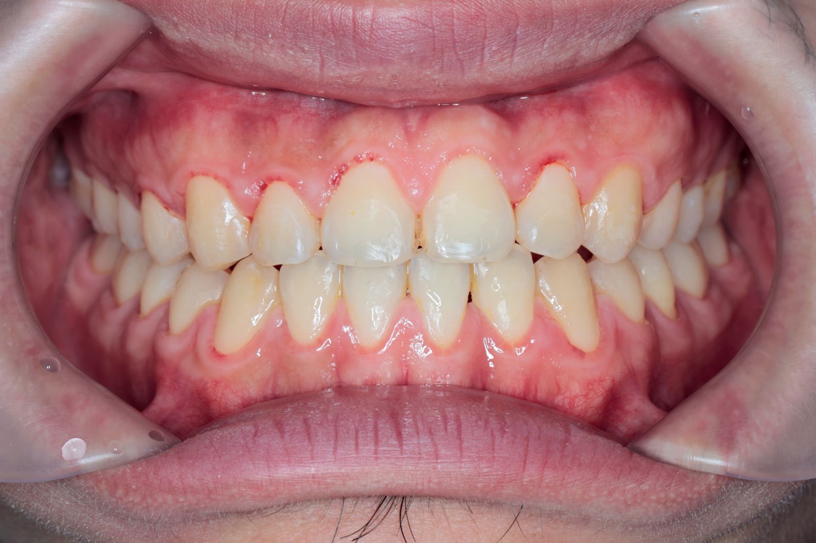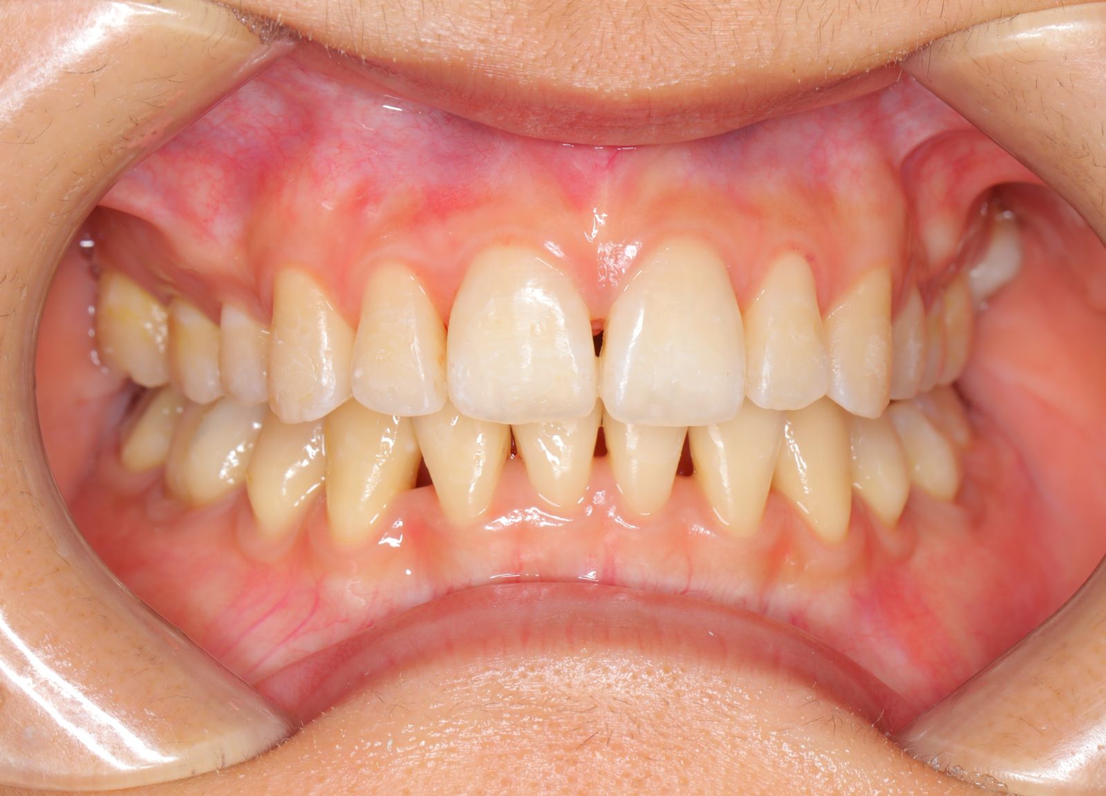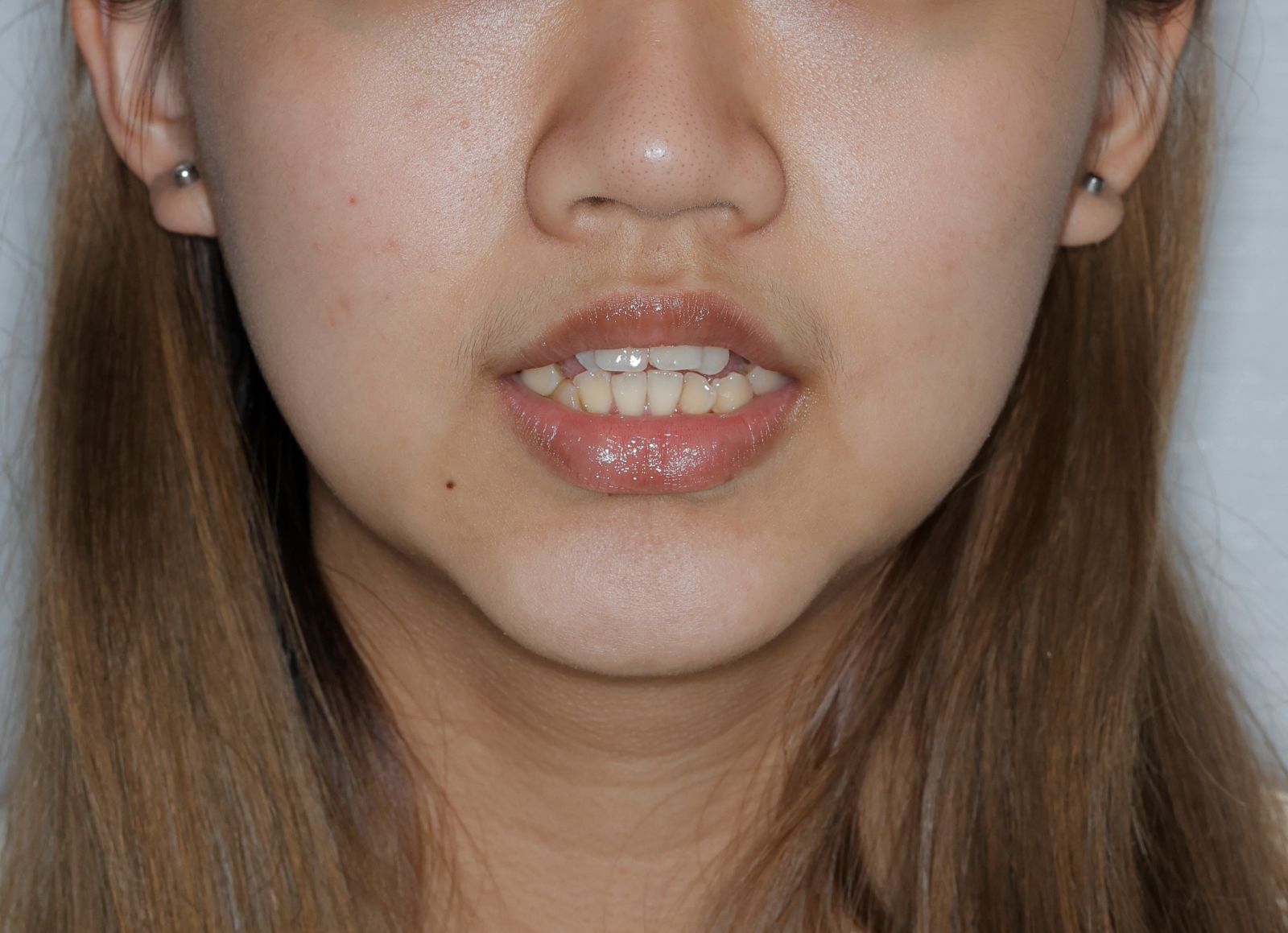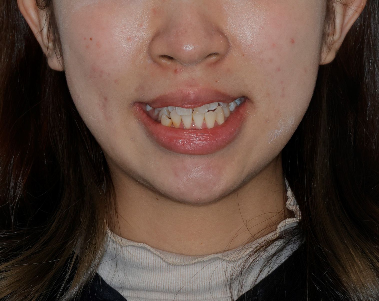 這位患者因為上下牙弓差距大以及牙齒亂影響咬合造成開咬。門牙暴嘴唇比較凸出,下巴線條不明顯。院長林政憲醫師幫患者拔除4顆小臼齒,讓牙齒有空間排整齊以外,還可以把門牙往後拉解決開咬來改善唇形。