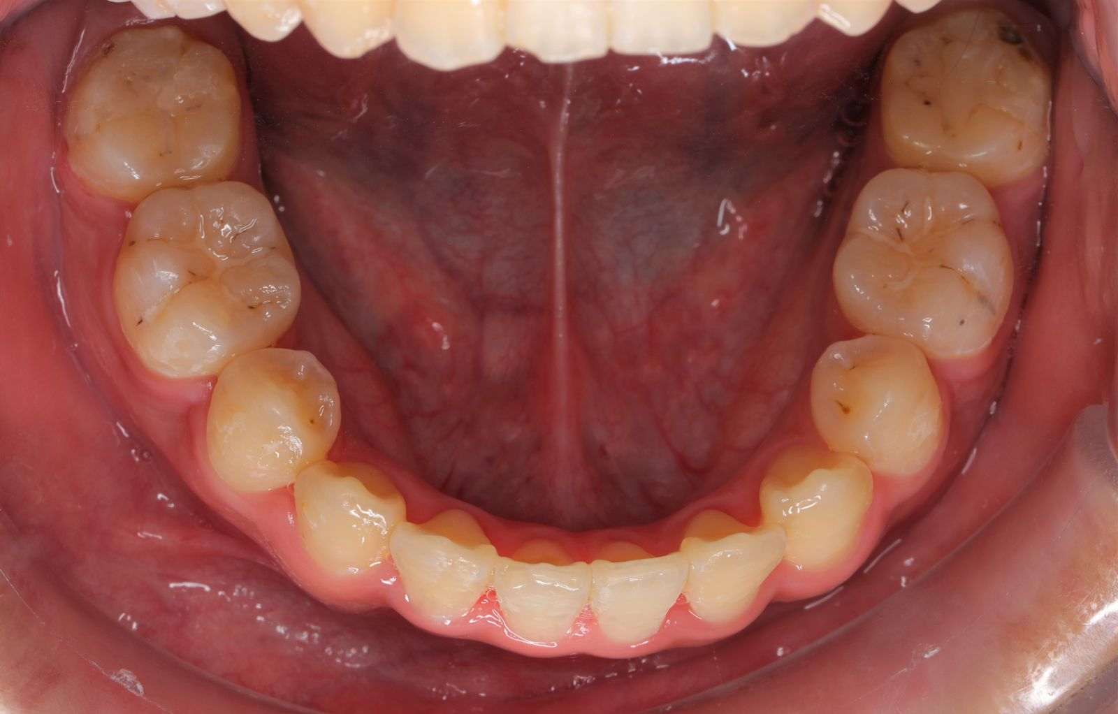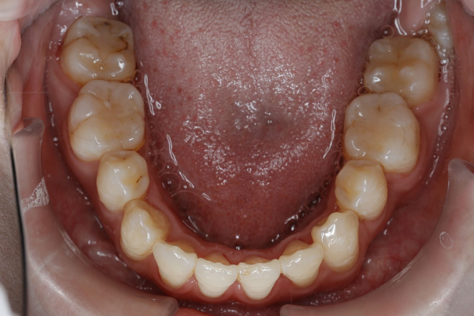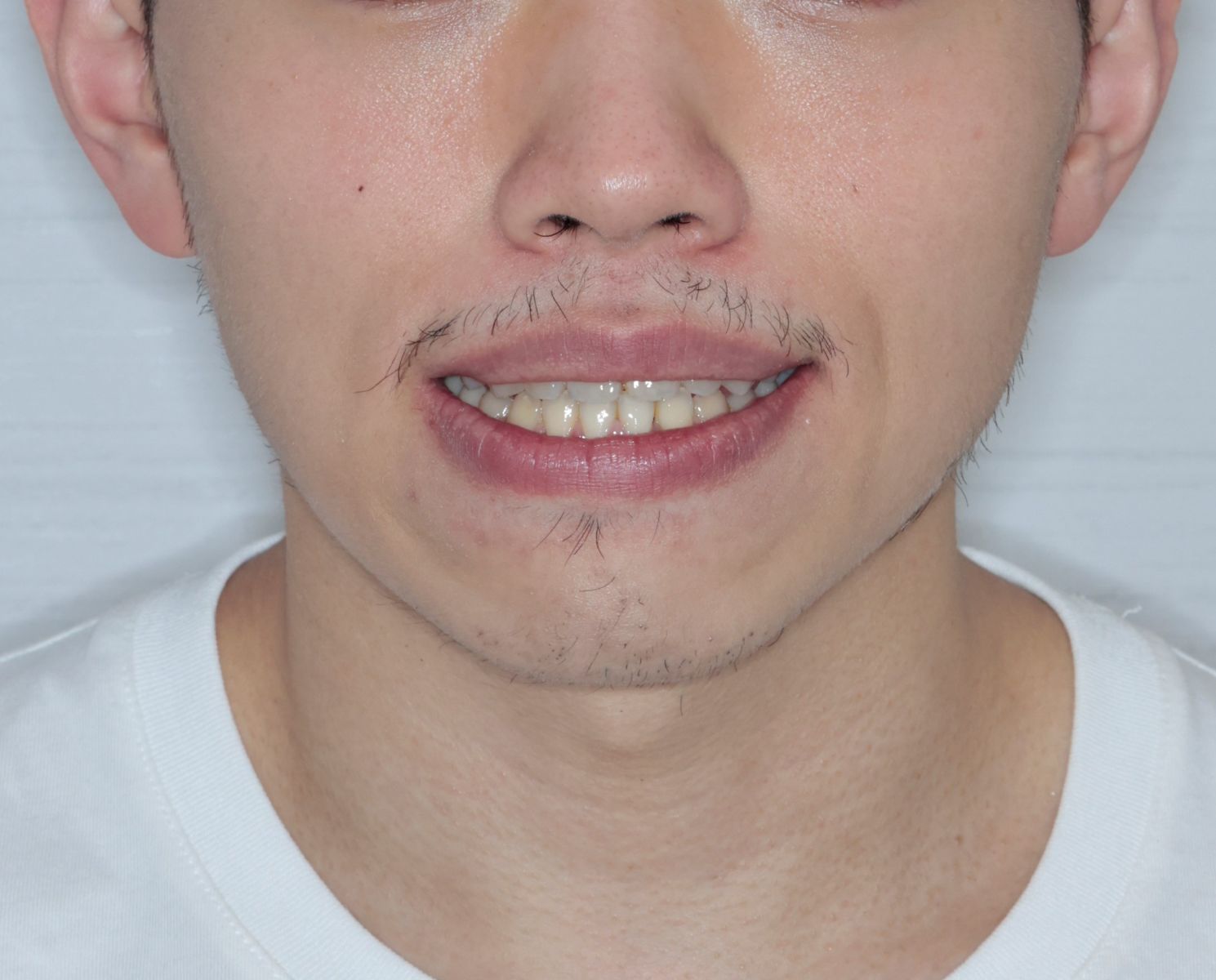 病患因為骨頭生長關係,導致下巴發育較多、較凸出,前牙反咬合且咬合不正造成下巴歪斜嚴重。矯正前,由院長林醫師判斷空間夠而且不需要拔牙,幫助患者將下排牙齒拉進來後,改善前牙相對關係,把縫關完恢復正常咬合,讓患者找回更自然自信的笑容。
