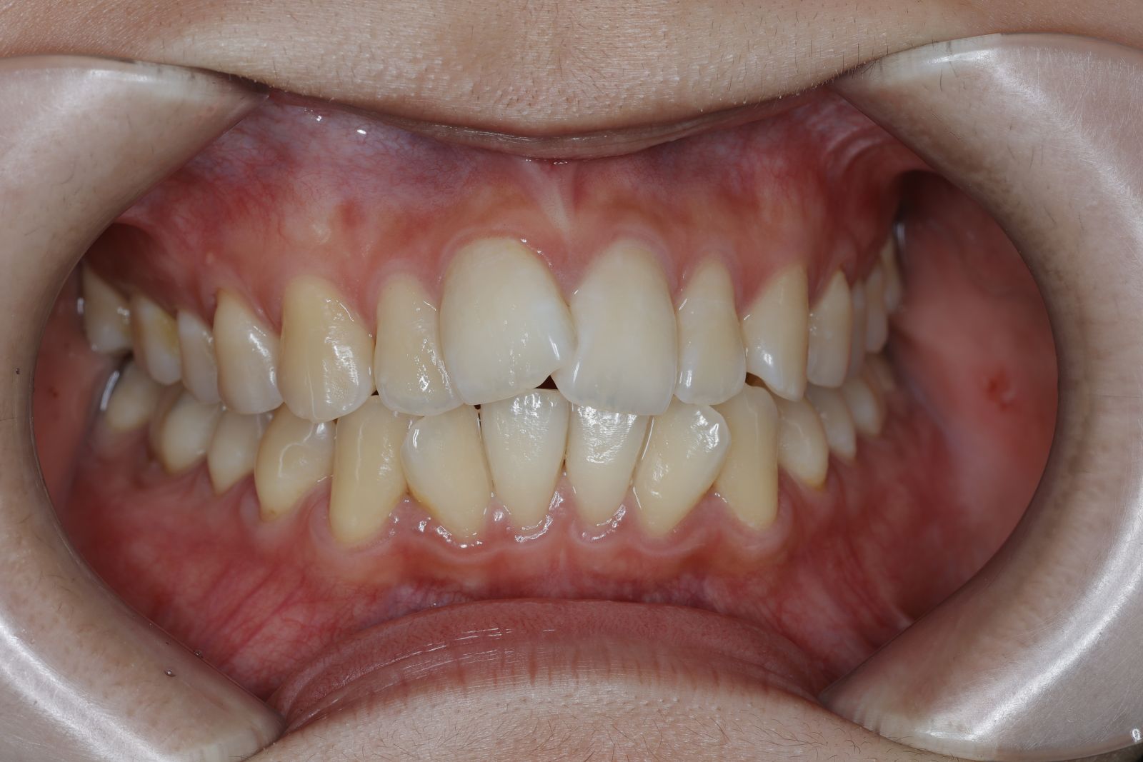 患者的主要訴求是,牙弓過窄空間不足造成牙齒亂,且門牙也較往外暴,讓上下唇形明顯都比較往外凸出。矯正期間,院長林政憲醫師幫患者拔除4顆小臼齒,讓牙齒有空間排整齊以外,還可以把門牙往後拉來改善唇形。