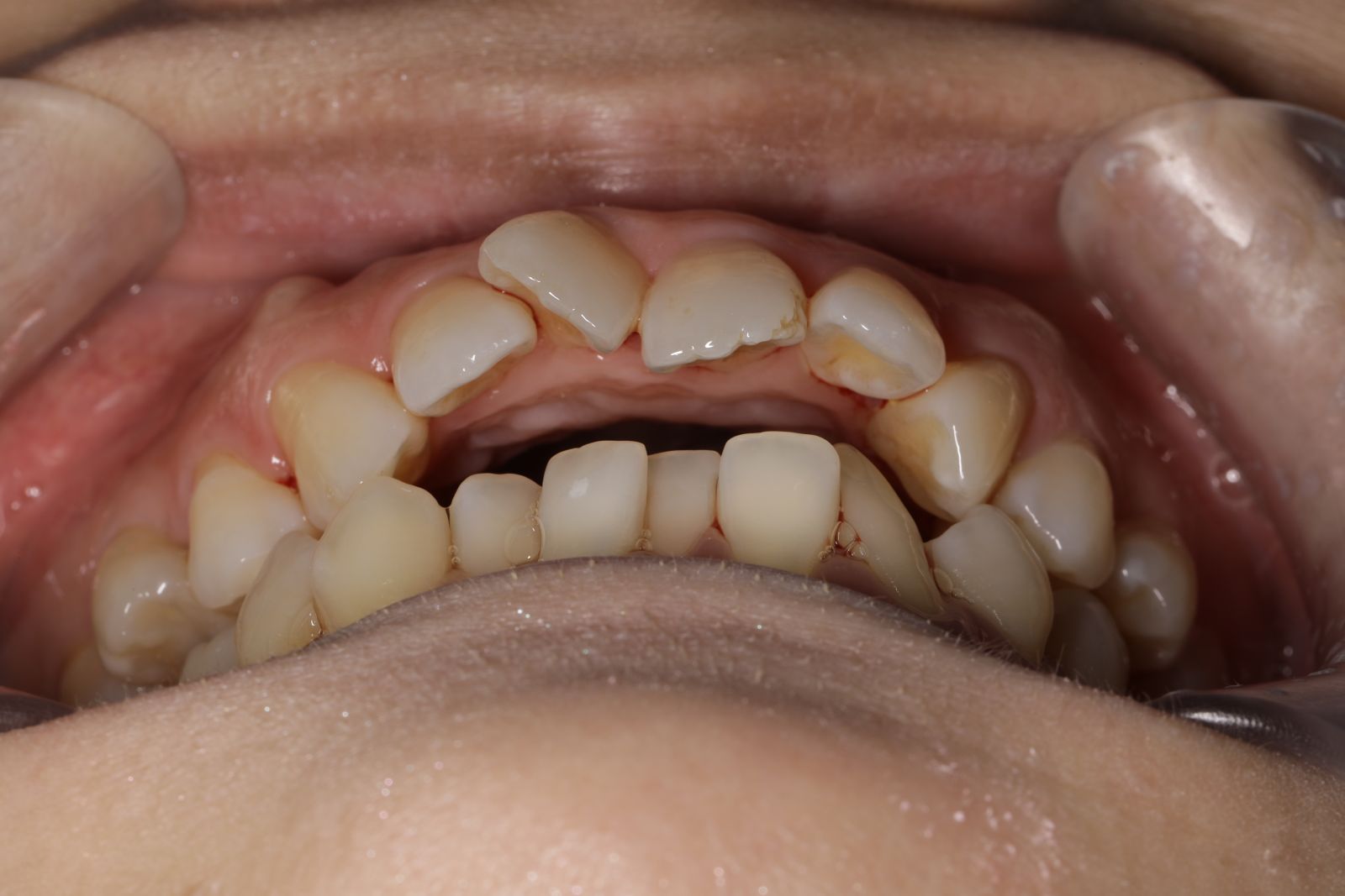 牙齒凌亂,上排牙弓較暴,上下門牙閉不起來,是我們俗稱的”開咬”