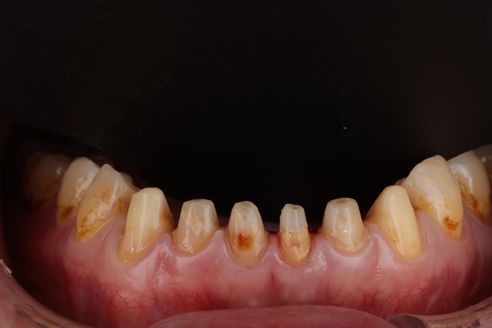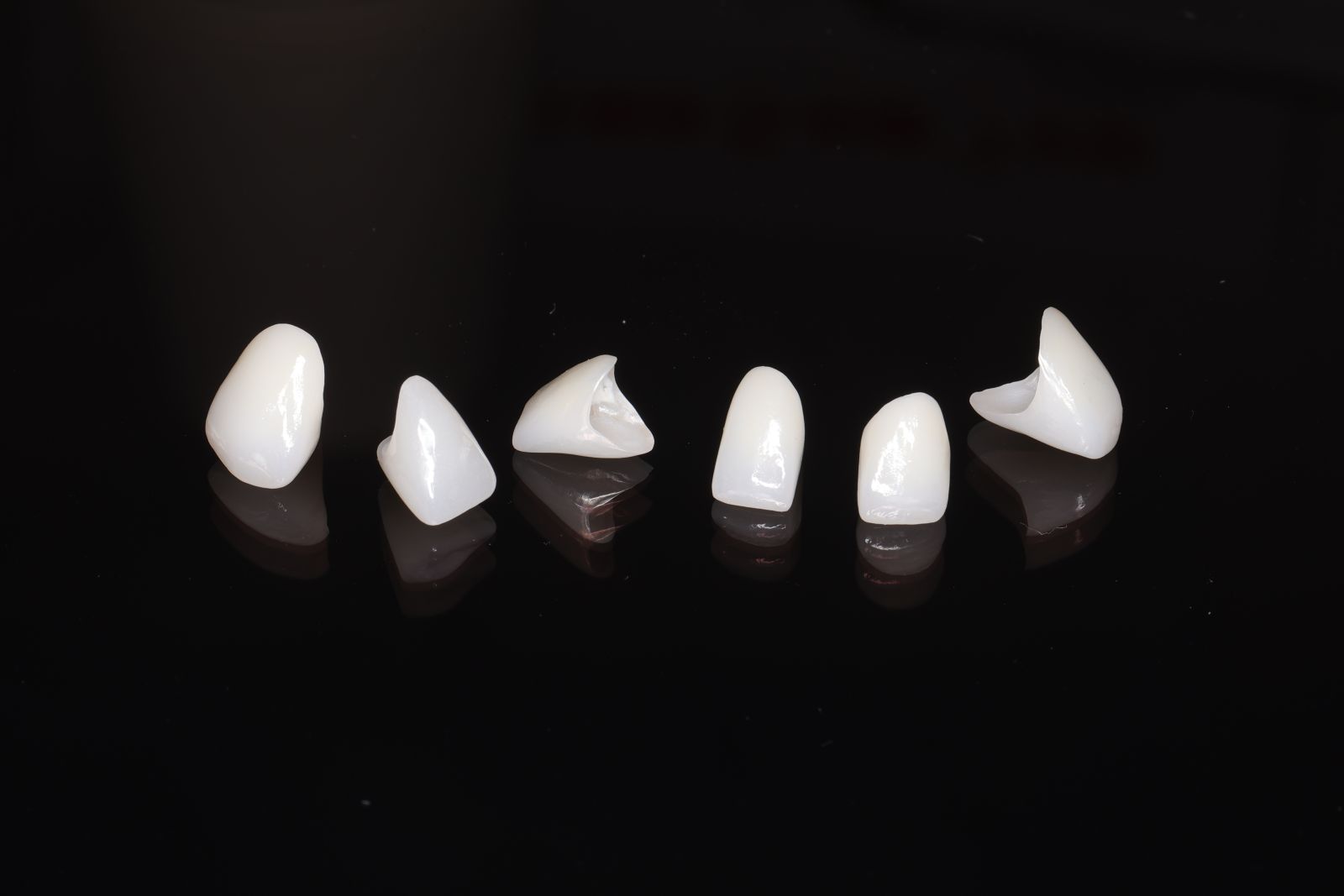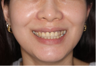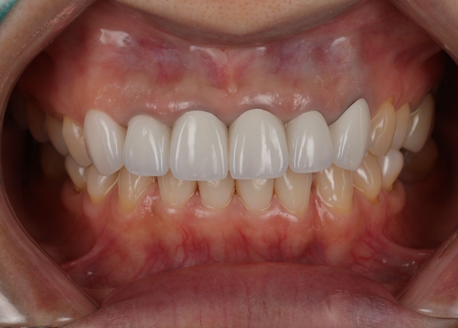 - 患者因為以前矯正疏於清潔,很多的蛀牙以及抽過神經的牙齒斷裂缺損,脆弱的牙齒影響健康及美觀。把牙齒磨小的過程會挖除蛀牙,保留健康的牙齒,用陶瓷纖維牙釘維持強度,過程會先用臨時牙套與醫師討論型態,最後依照自己喜歡的顏色及外型設計專屬於自己的前牙美學全瓷冠假牙!