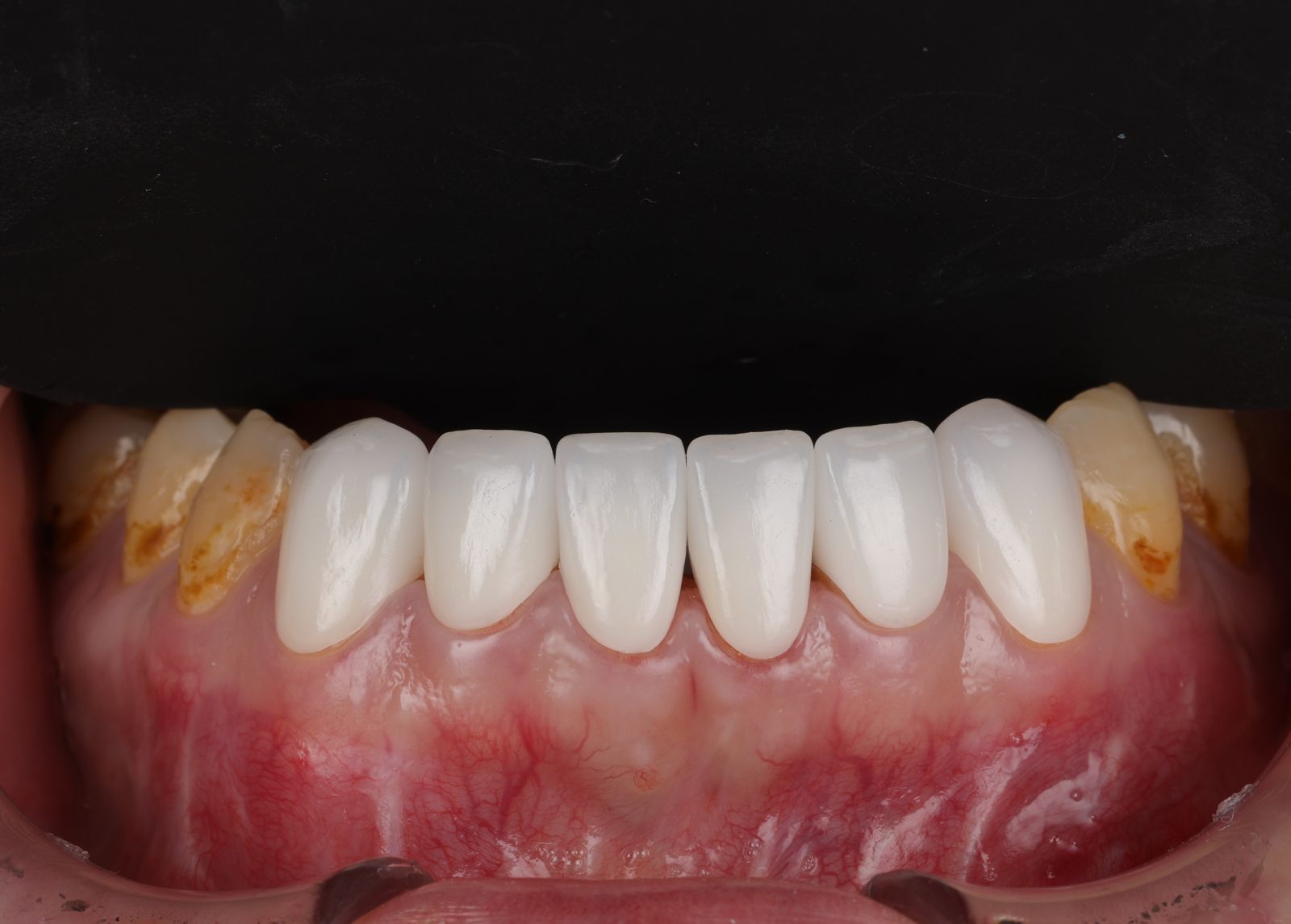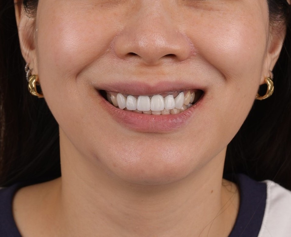 希望牙齒前牙區能一致變白,型態上也希望能調整得更自然,跟醫生討論之下決定把笑容區6顆牙齒都一起做前牙美學,用全瓷冠搭配美白貼片一起處理!