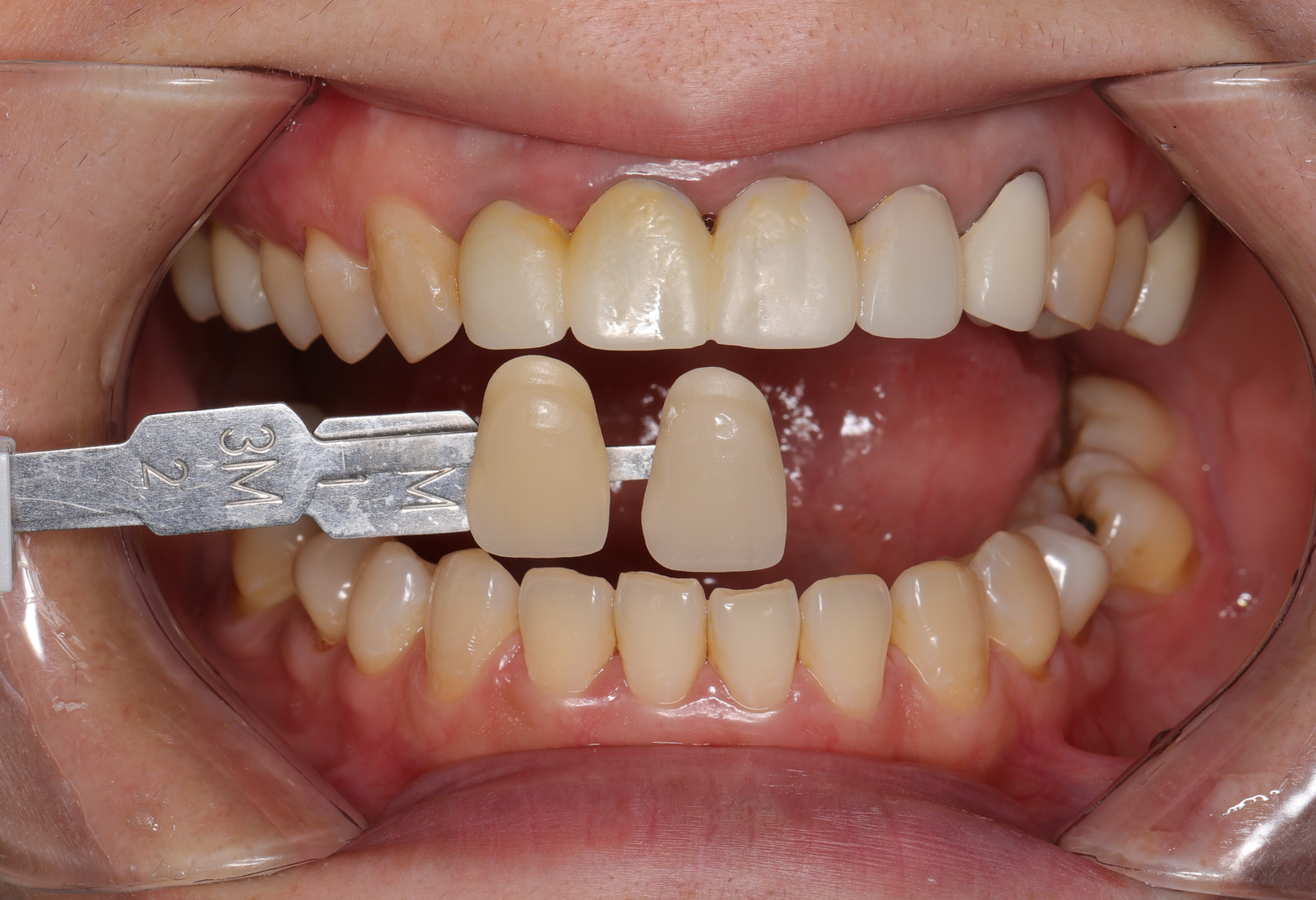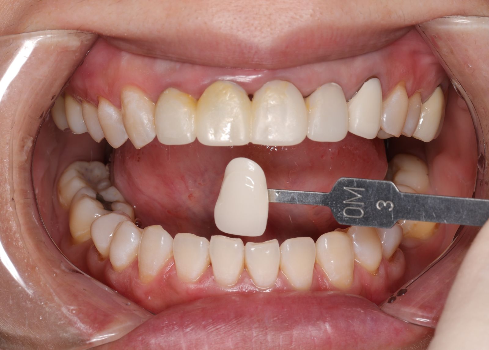 - 先把舊的假牙拆除後換成臨時假牙,期間先做冷光美白讓牙齒的基礎顏色變白,用保養型冷光美白,讓其他自然牙的部分可以白2~3個色階。一段時間讓顏色穩定後就可以當作正式全瓷冠的顏色參考。
